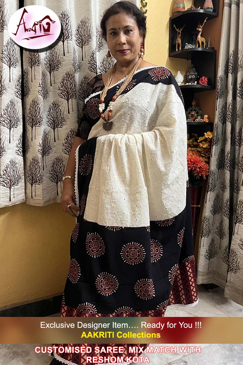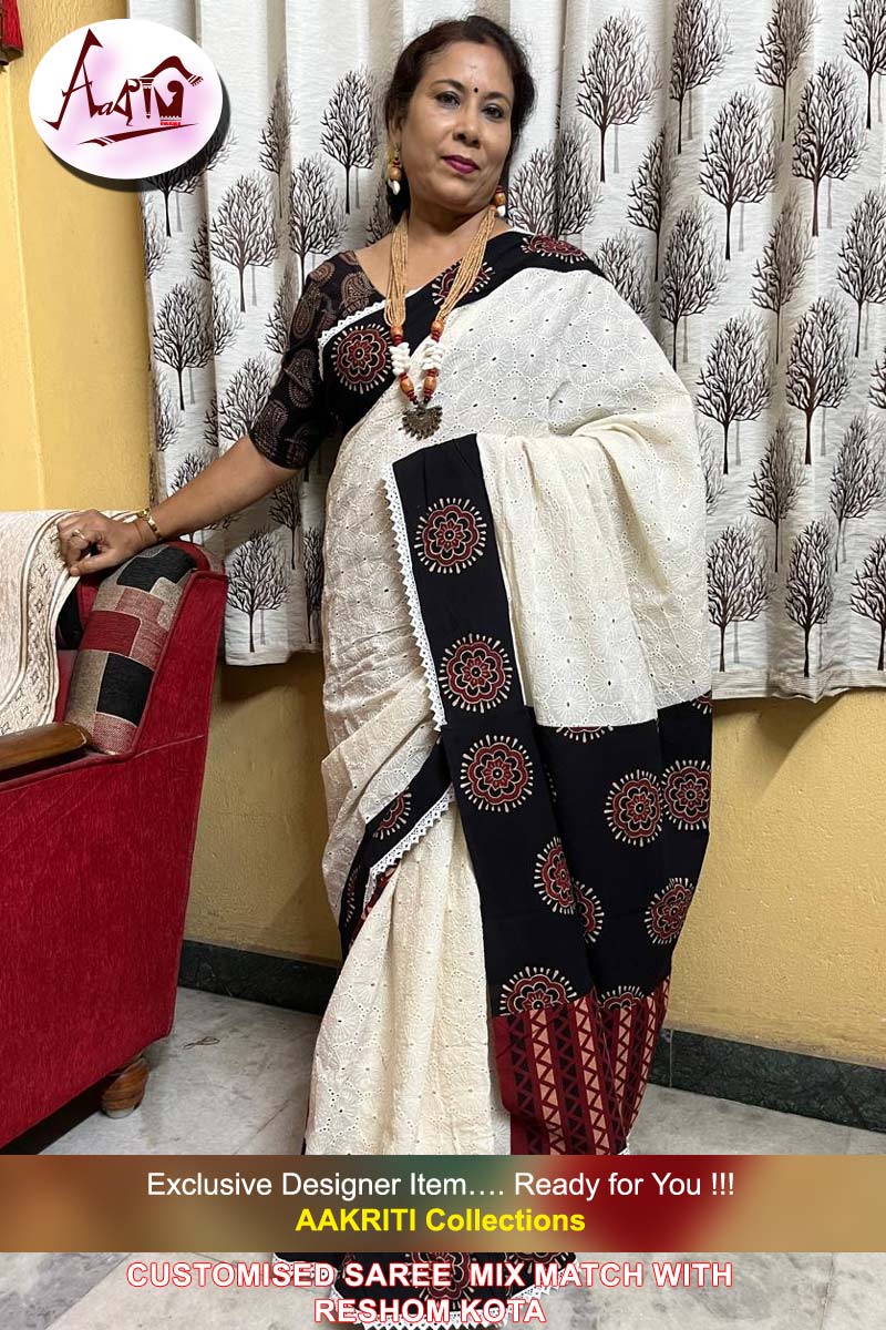Customised Saree with Applique Work On Off White Hacoba saree with BP
